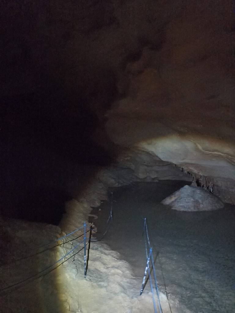 Tras una tranquila exploración, llegamos al punto central de la sima, conocido como el Desierto debido a la capa de arena sorprendentemente fina que cubre toda la zona. Unas balizas marcaban el recorrido en esta zona, pero para nuestra sorpresa, el desierto no hacía honor a su nombre y estaba rebosando de agua.