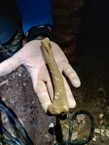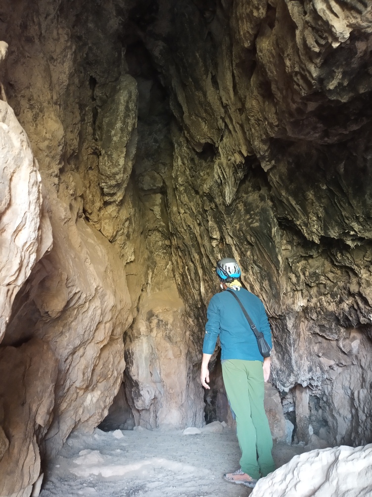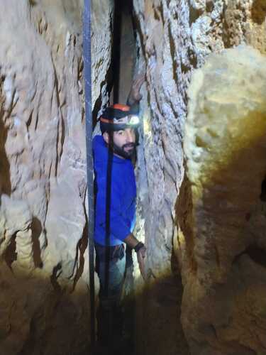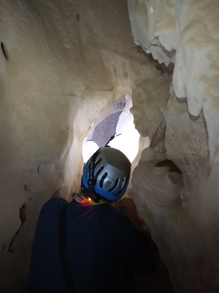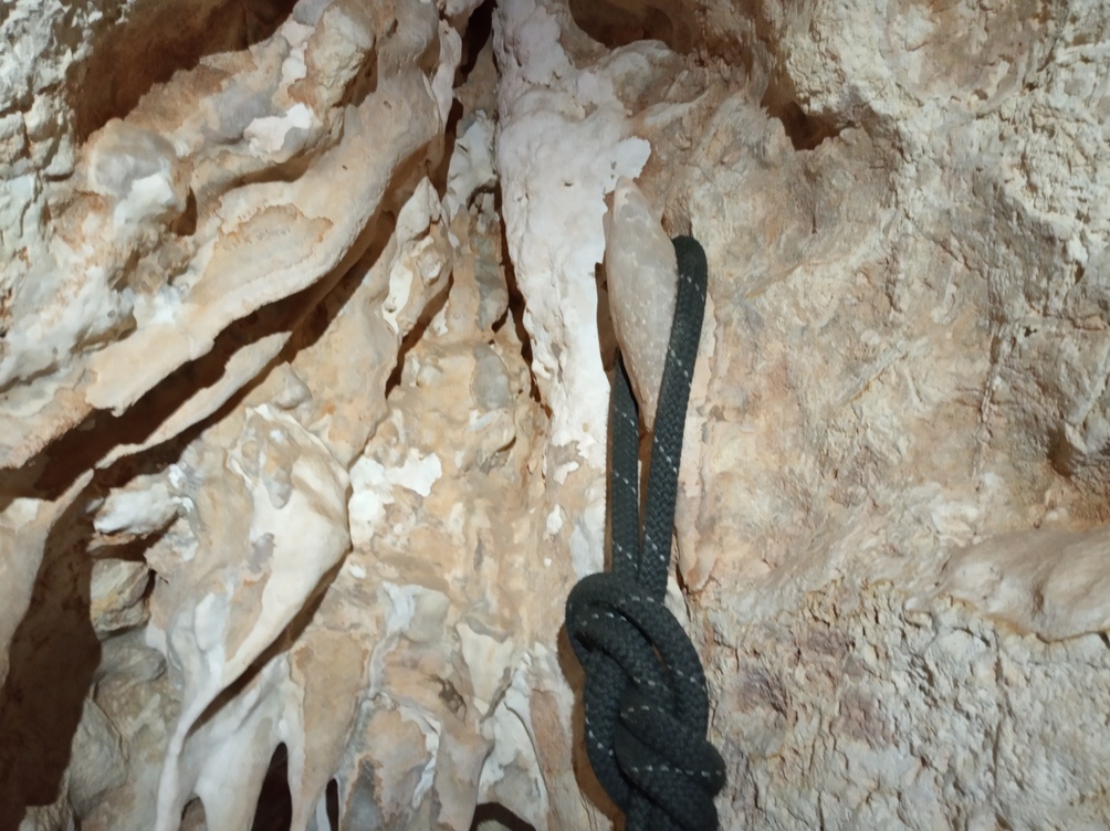 Al llegar al abrigo visos en la pedrera restos de estalagtitas (buena señal) y nos dimos cuenta de que era más profundo y grande de lo esperado. entramos y vemos que al fondo hay unos cuantas formaciones de poco interés y lo que parece el fin de la cueva, sin embargo, nos metemos en el agujerto y vemos que por una pequeña abertura la cosa sigue. Atamos la cuerda a una columna y seguimos para abajo.