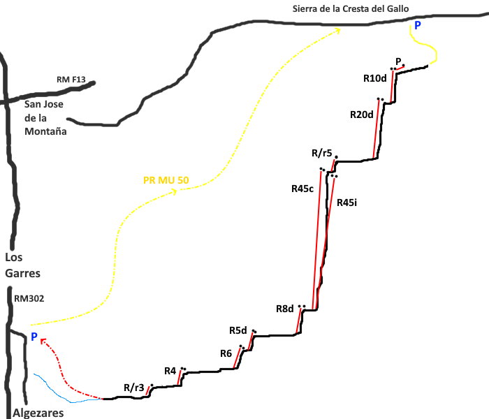 Con dos coches 5 minutos. Si tenemos dos coches, con el de acceso continuaremos por la carretera unos kms hasta San José de la Montaña, desde aquí parte una carreterilla que sube hacia la sierra de la Cresta del Gallo, en menos de 4kms encontramos una curva de izquierdas con una zona abierta a la derecha donde aparcar, una especie de mirador. Desde el aparcamiento de acceso cogeremos una senda que se mete en la vaguada y al poco el primer rápel