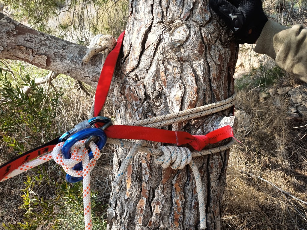 Rápel 1: desde un pino, hay un cordino con un maillón.