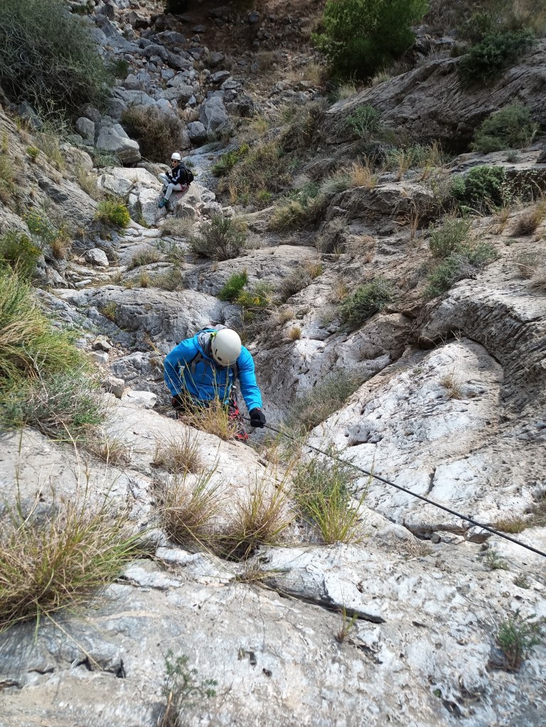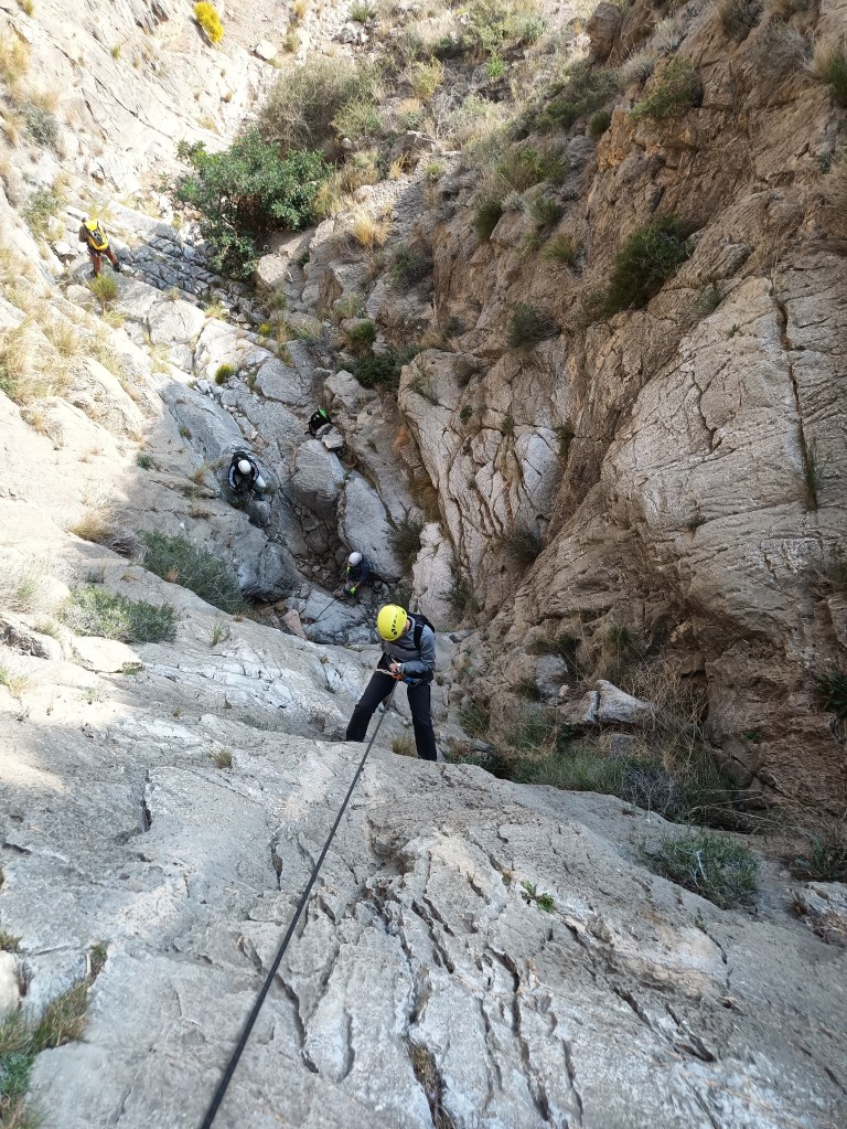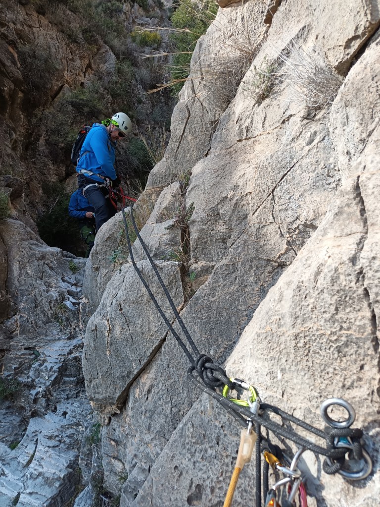 Rápel 2: hay un pasamanos a la izquierda que nos deja en la cabecera del rápel. A mitad hay un fraccionamiento a la izquierda con un pequeño pasamanos fijo, pero nosotros decidimos hacerlo del tirón y la verdad que bastante bien. Se recupera perfectamente.