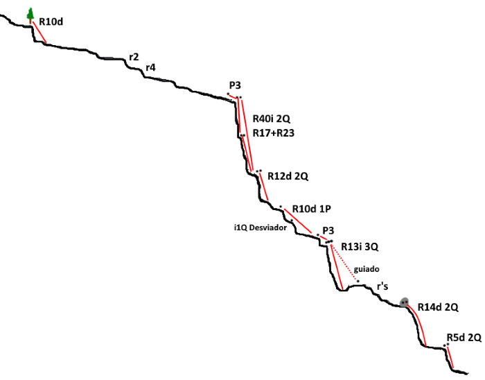 Tras el primer rápel tendremos una zona de destrepes para acercarnos a la vertical de 40m que está fraccionada, donde tendremos que instalar el pasamanos de acceso. Deberemos tener claro si queremos fraccionar o no para la gestión de cuerdas. Justo abajo tenemos el siguiente rápel mucho más corto, que nos lleva a otro rápel con posible desviador a la izquierda. Haremos el siguiente rápel con posibilidad de montar un guiado, antes de los dos últimos rápeles.