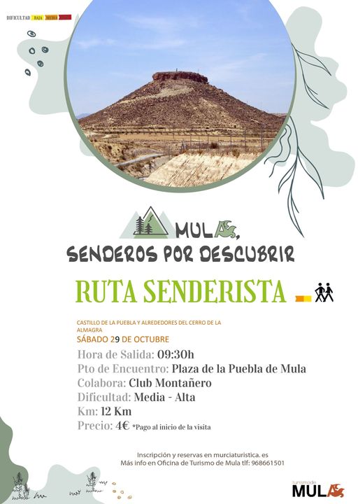 El 29 de octubre el Club junto con el ayuntamiento de Mula llevan a cabo una ruta por el río Mula, pasando por el Cerro de Alcalá (Castillo de la Puebla de Mula) y por los alrededores del Cerro de la Almagra de los Baños. Una bonita ruta que no deja indiferente a nadie por la belleza de los rincones del Río Mula y por las magníficas vistas desde el Cerro de Alcalá.