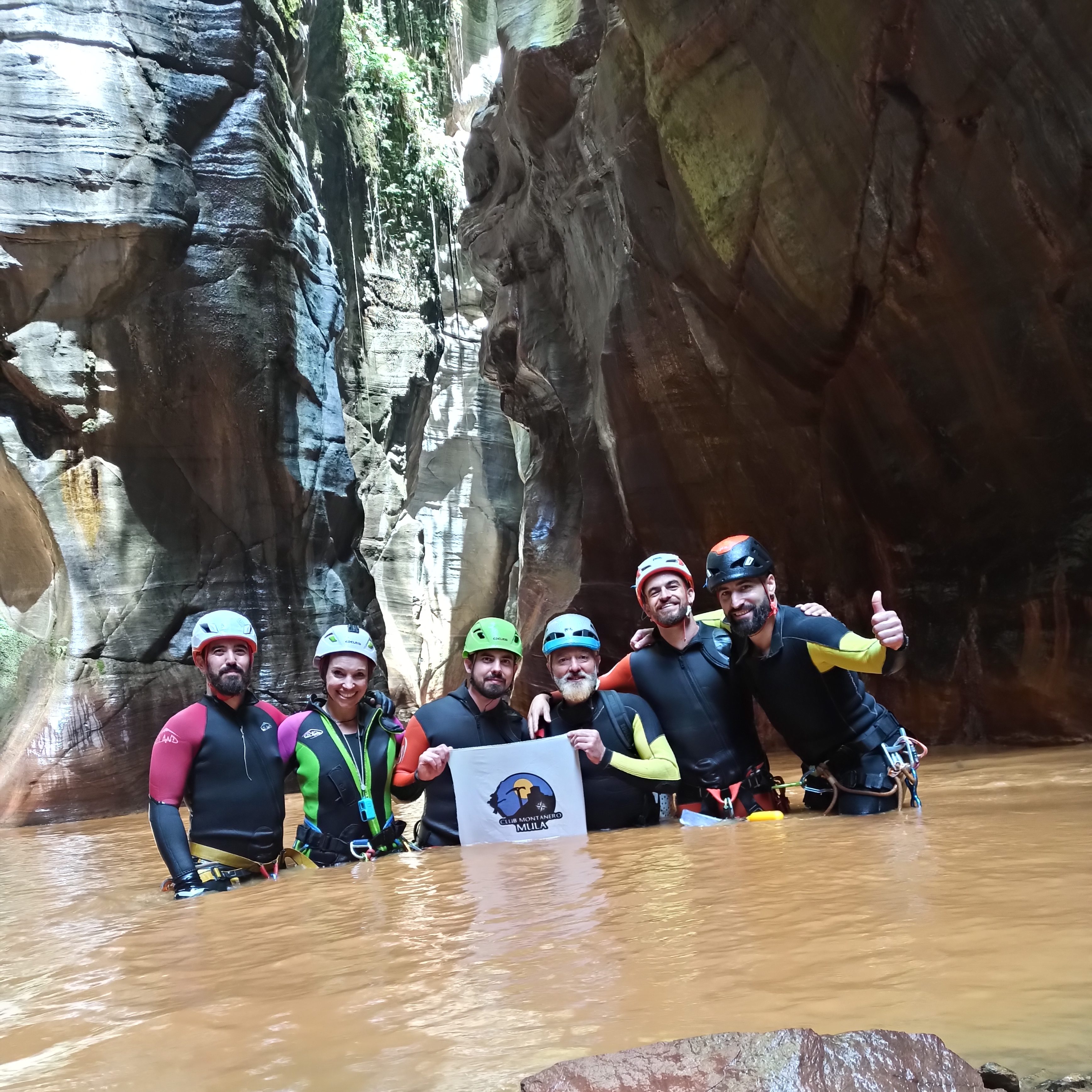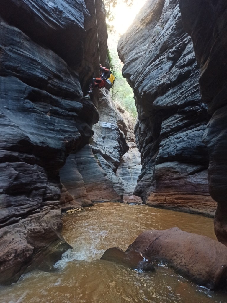 Partimos temprano para evitar el sol y afrontar la aproximación de 1h más o menos. Llegamos al primer rapel los primeros de la mañana aunque el resto de grupos tardaron poco en llegar. Empezamos con 4 rápeles que ya nos enseñó lo que nos depararía el resto del barranco. Tras un tramos de «jaleo piedras» llegamos a la parte más técnica e impresionante del Trévelez, el segundo tramo.