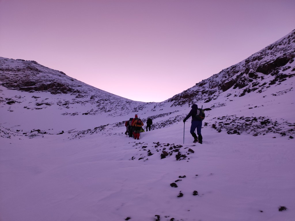 Tras el vuelo y primer día de turismo por Marrakech, siendo el día 30 cuando ponen marcha hasta Imlil, puerta de entrada a la ruta convencional del Toubkal, y de hay ya con todo el equipo cargado en mulas, como es costumbre por allí, comienzan la subida en este primer día hasta el refugio Neltner, una subida larga pero cómoda, donde la climatología hace de las suyas y cambia radicalmente de un sol explendoroso a una cortina de nieve y fría en la últimas horas de subida.