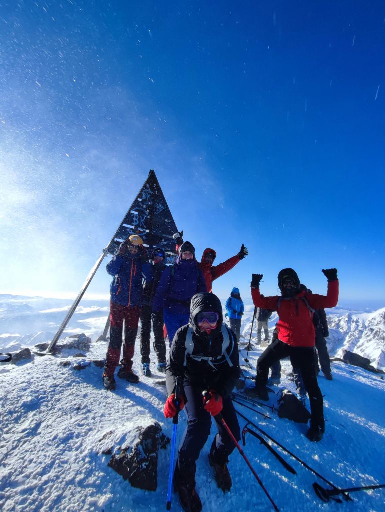 Una vez en el collado que parte el Toubkal del Toubkal Oeste el tiempo es tremendamente lamentable dando lugar a la retirada de la mayoría de los que lo están intentando esa mañana, nuestro equipo sigue adelante, aunque poco metros después, dos de nuestros compañeros, con mucho pesar y a menos de 15min de la cima, deciden retirarse debido al mal tiempo. El resto consiguen la hazaña cerca de la 10 de la mañana.