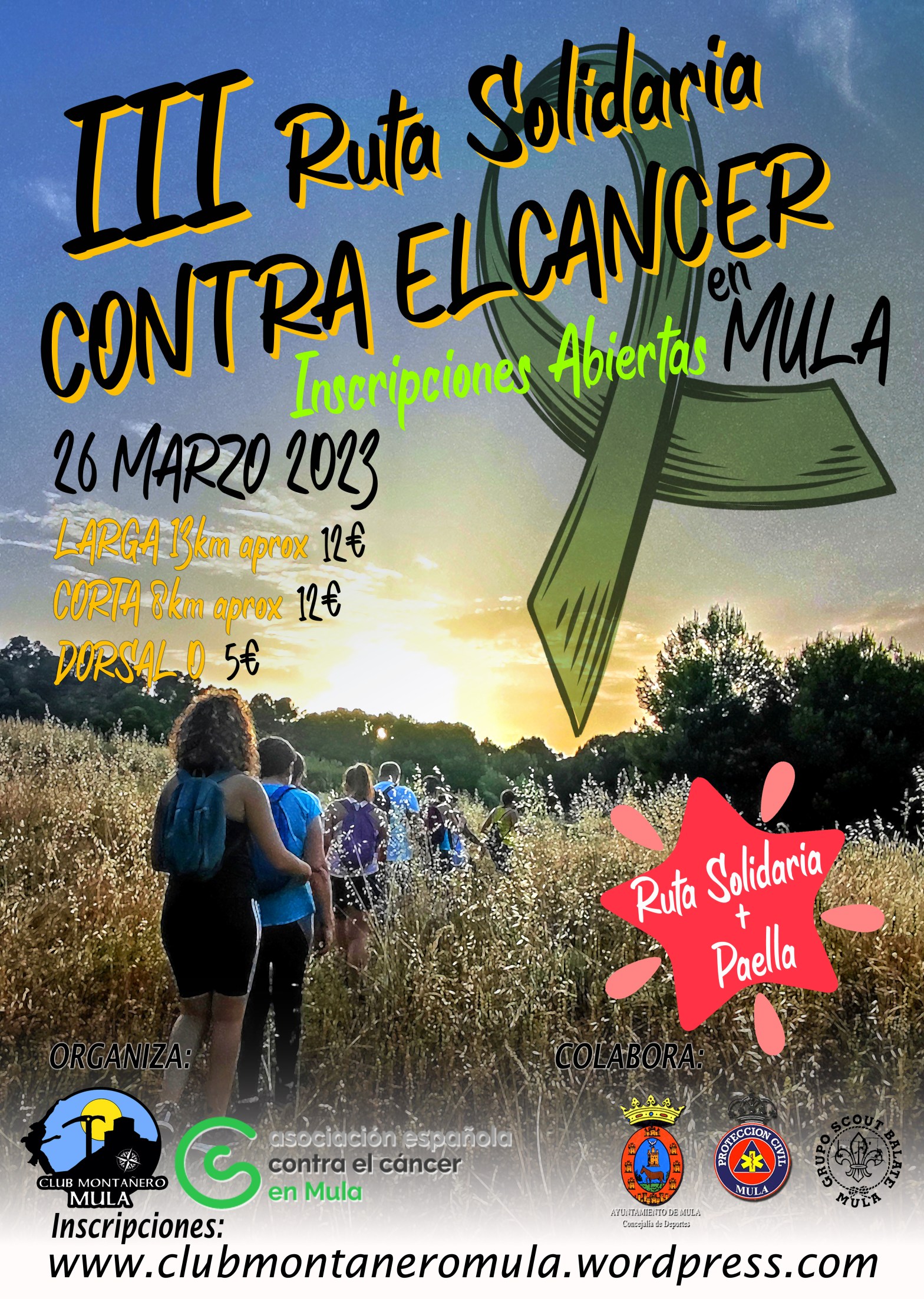 El pasado domingo 26 de marzo tuvo lugar la III edición de la Ruta solidaria contra el cáncer que organiza el Club Montañero de Mula junto a la Asociación del Cáncer de Mula. A la ruta acudieron casi 250 participantes que disfrutaron de una increíble mañana por el entorno de Fuente Caputa divididos en 3Sigue leyendo «III Ruta Solidaria Contra el Cáncer»