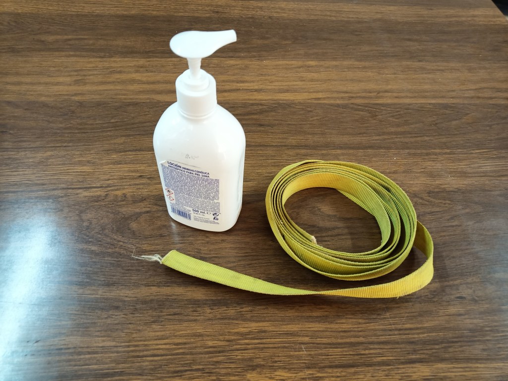 Sólo necesitas unos 2,5 metros de cinta plana (en mi caso es de un trinquete de sujetar cargas) y un trozo de plástico que puedes conseguir de cualquier envase.