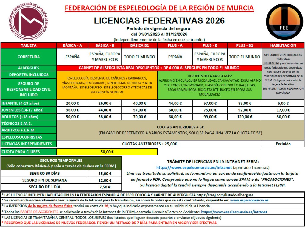 Este año, todas las licencias federativas estarán habilitadas en la recién refundada Federación Española de Espeleología. Además, la FERM abrirá cada dos semanas el Espeleódromo El Limonar para poder practicar TPV, y se programará una salida mensual a cavidades de la Región, todo ello instalado y guiado por técnicos de la EME. Se enviará más información a los federados próximamente.