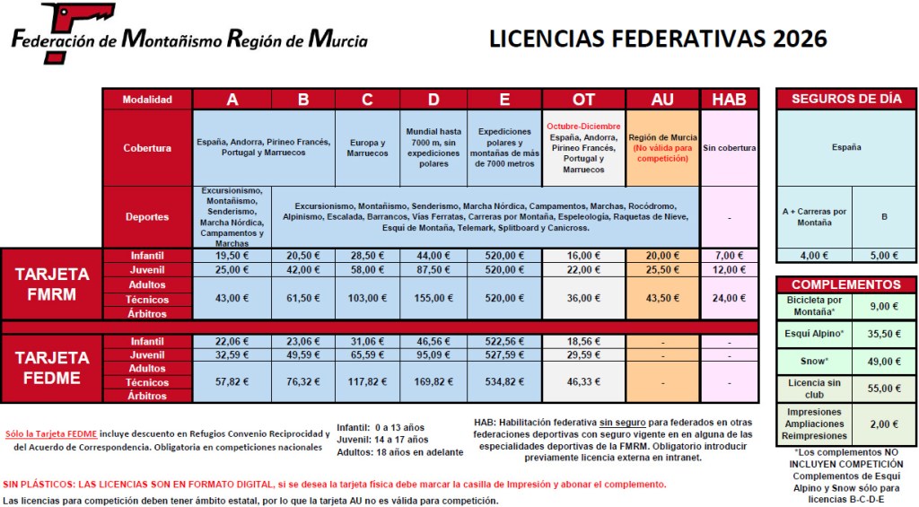 Acuerdo de correspondencia de refugios: Las federaciones autonómicas de montaña de Cataluña (14 Refugios), Aragón (16), Navarra (1), Asturias (7) y País Vasco (1) han dejado de estar dentro del Convenio de Reciprocidad de la FEDME, juntas suponen 39 refugios de montaña y 2.210 plazas (podéis consultar el listado en https://correspondenciarefugios.org), creando un Acuerdo de Correspondencia de Refugios al que se han sumado otras federaciones territoriales, entre ellas la de Murcia, para tener los descuentos habituales. Esto supone que en estos refugios será válida para obtener esos descuentos la licencia FMRM y la FEDME-Murcia* La FEDME no ha considerado integrarse en dicho acuerdo, por lo que el habitual Convenio de Reciprocidad de refugios ofrece en España sólo 3 refugios. En concreto, los de Andalucía (2 Refugios), Castilla y León (1), junto con los refugios europeos de Suiza, Alemania, Austria, Francia, Italia. Esto supone que en estos refugios solamente será válida para obtener descuentos la tarjeta FEDME. La única excepción o exclusión, lógicamente, a todo lo anterior son las licencias AU autonómicas cuyo ámbito de cobertura es exclusivamente la Comunidad Autónoma de la Región de Murcia. *FEDME tramitada en la Federación Murciana.