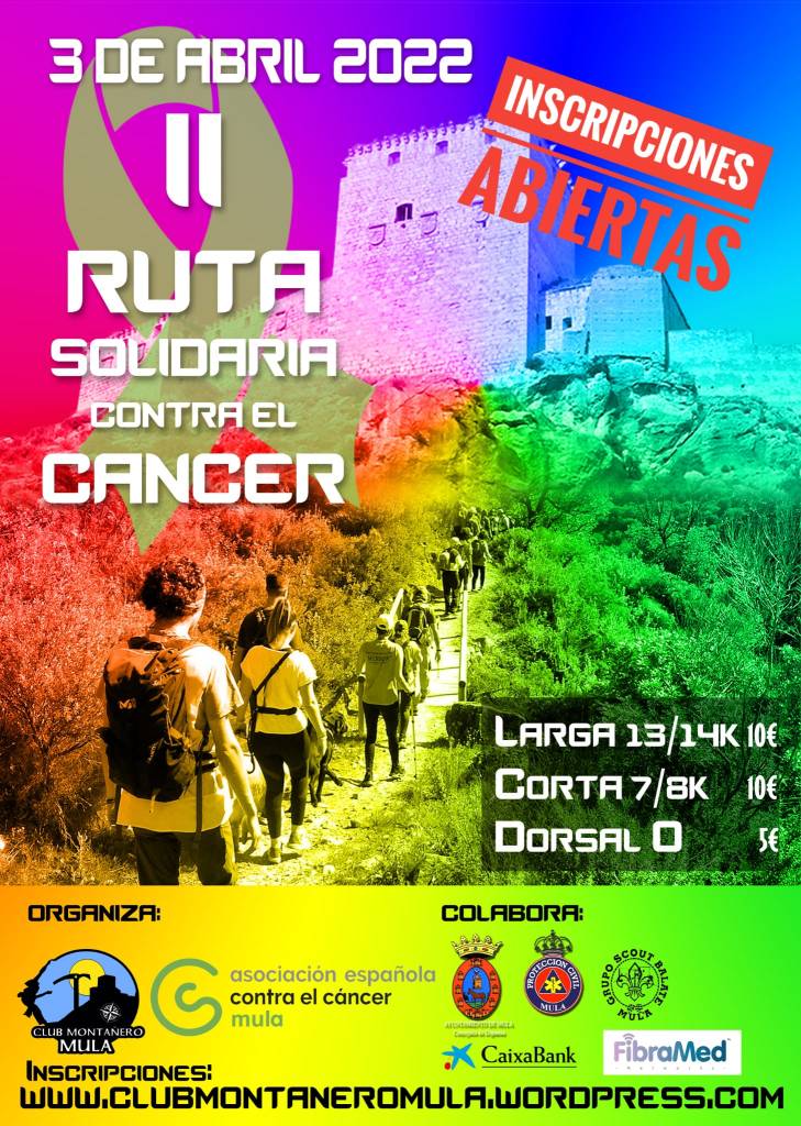 Tras un parón debido a la pandemia, volvemos a la carga, este año os tenemos preparado un recorrido con salida desde una de las pedanías de Mula. Lo hemos dividido en 2 categorías para que podáis escoger la que más se adapte a vuestro nivel. Como siempre contaremos con la opción de «dorsal 0» para aquellos que simplemente queráis colaborar pero que no podáis asistir, os recordamos que la recaudación está destinada íntegramente a la Asociación Española Contra el Cáncer.